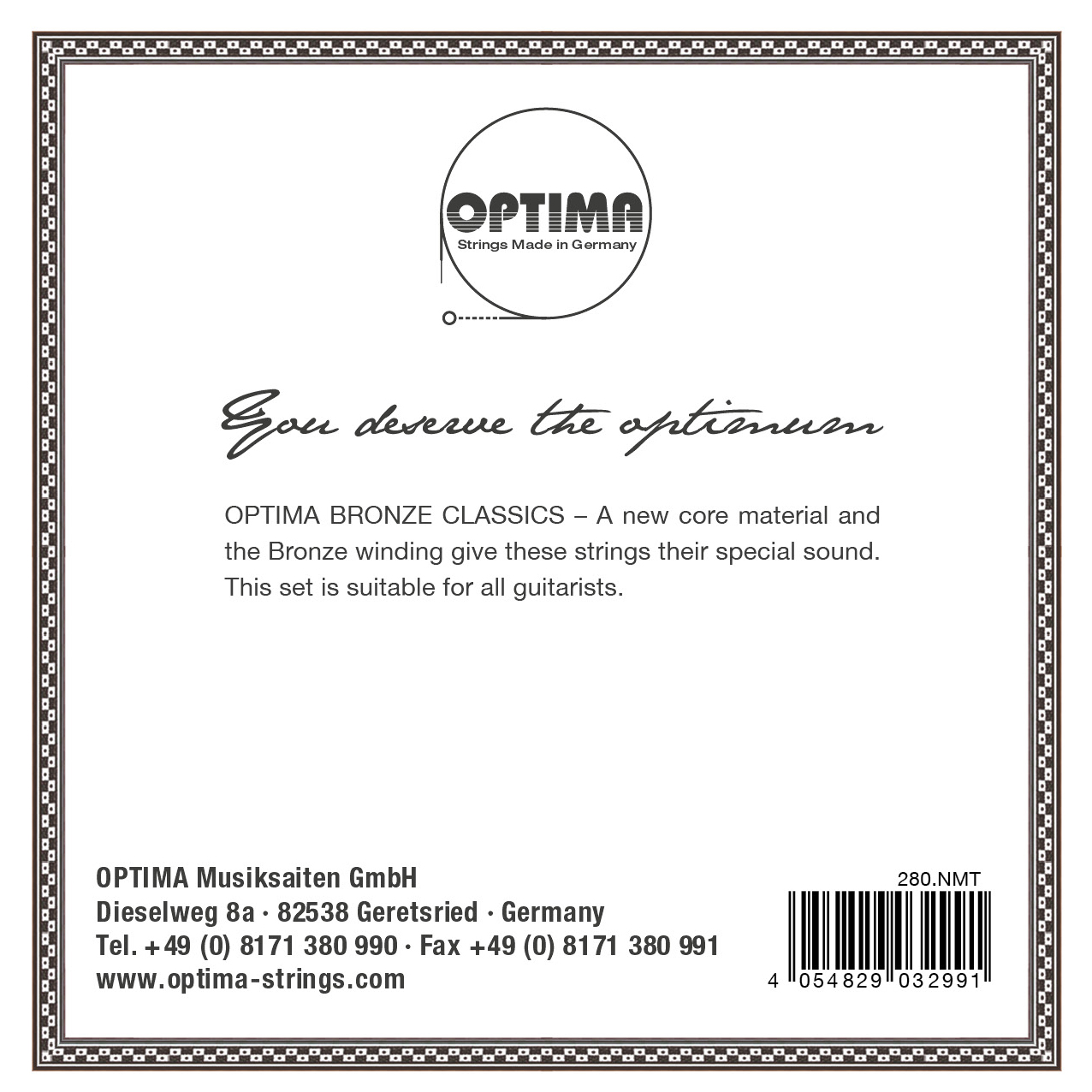 OPTIMA BRONZE CLASSICS – unser neues Konzept bei der Entwicklung der No.6 Serie war auch hier die Grundlage für die Weiterentwicklung dieser beliebten Saitenserie. Eine extrem gute Saite, die für jeden Gitarristen geeignet ist. Die Bronze Umspinnung verleiht ihr eine eigene Klangschönheit.