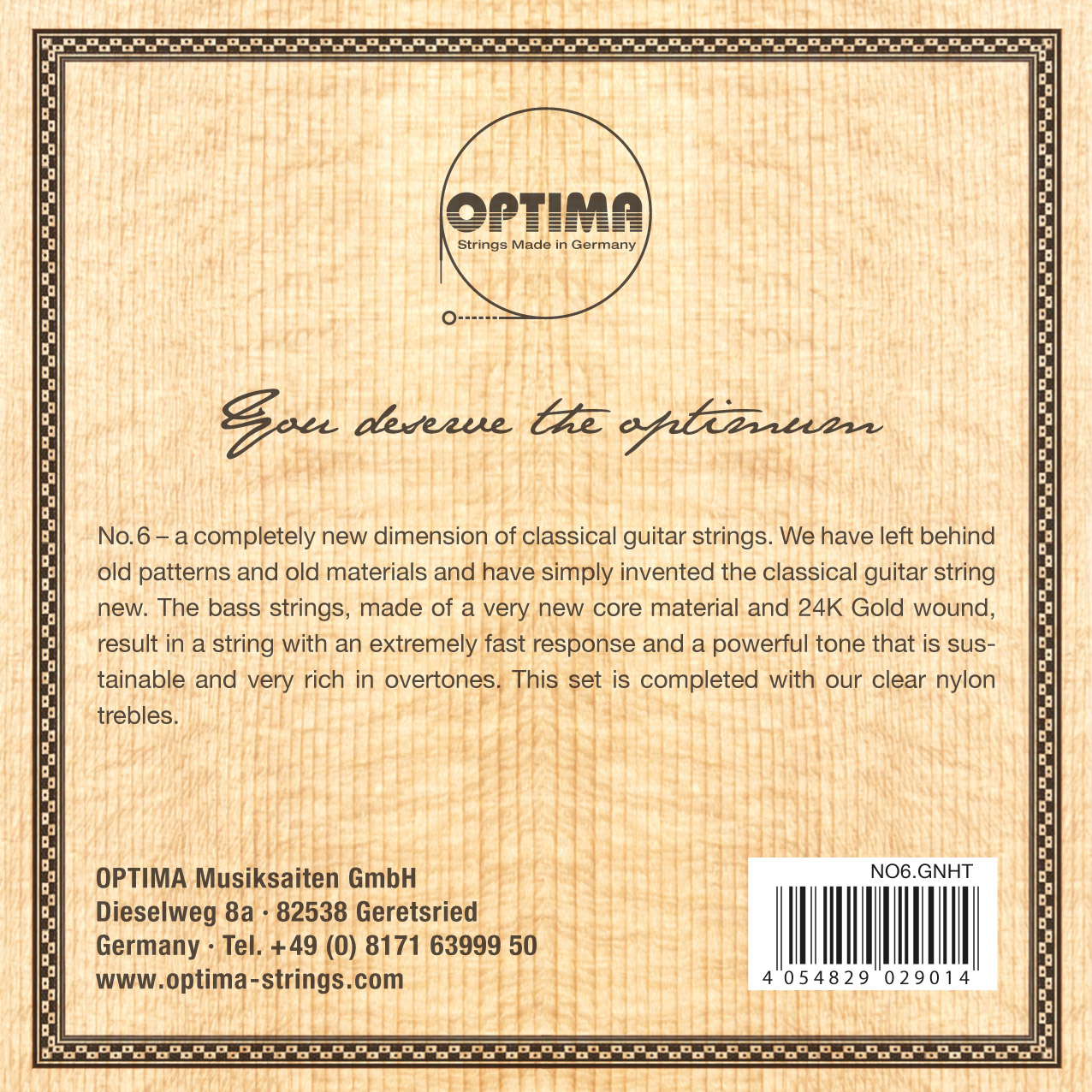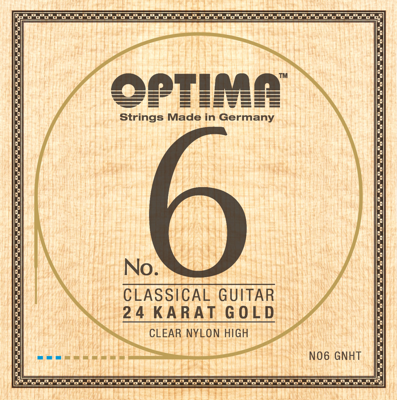 OPTIMA No.6 Every concert guitarist should remember the name of these strings, because they bring forth an entirely new dimension. We have left behind old patterns and materials and have merely reinvented the classical guitar string. The bass strings are made with a wholly new core material, wound with a 24 Karat Gold plated wire, resulting in a string with an extraordinary fast response, a powerful sustainable tone very rich in overtones, where the sound spectrum remains perfectly balanced. The set is completed with our Clear Nylon treble strings.