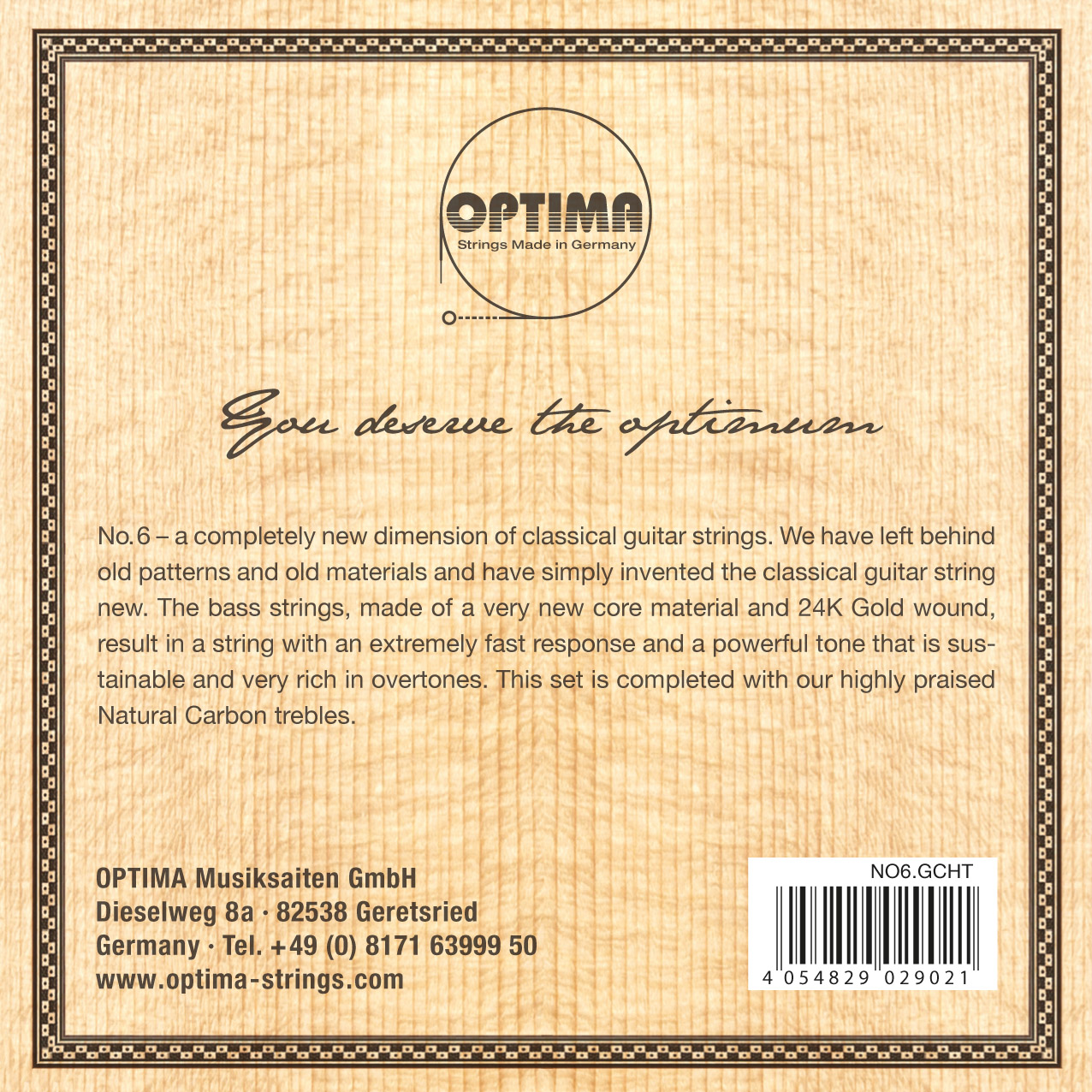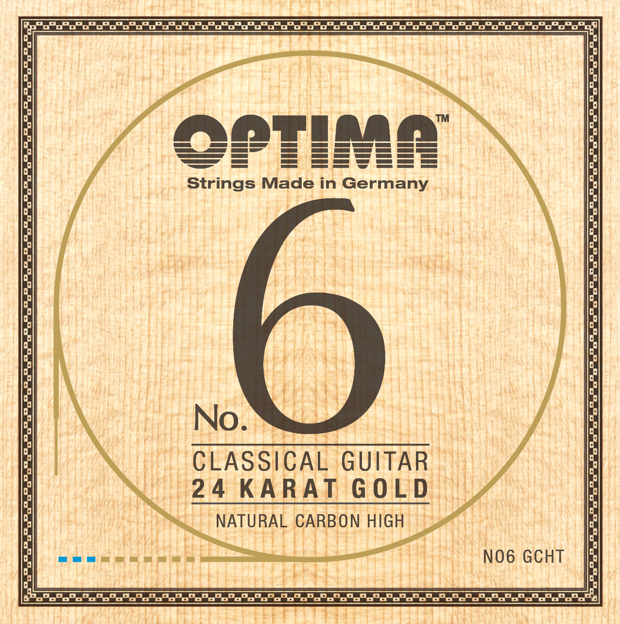 OPTIMA No.6 Every concert guitarist should remember the name of these strings, because they bring forth an entirely new dimension. We have left behind old patterns and materials and have merely reinvented the classical guitar string. The bass strings are made with a wholly new core material, wound with a 24 Karat Gold plated wire, resulting in a string with an extraordinary fast response, a powerful sustainable tone very rich in overtones, where the sound spectrum remains perfectly balanced. The set is completed with our Clear Nylon treble strings, or our highly praised Natural Carbon treble strings.